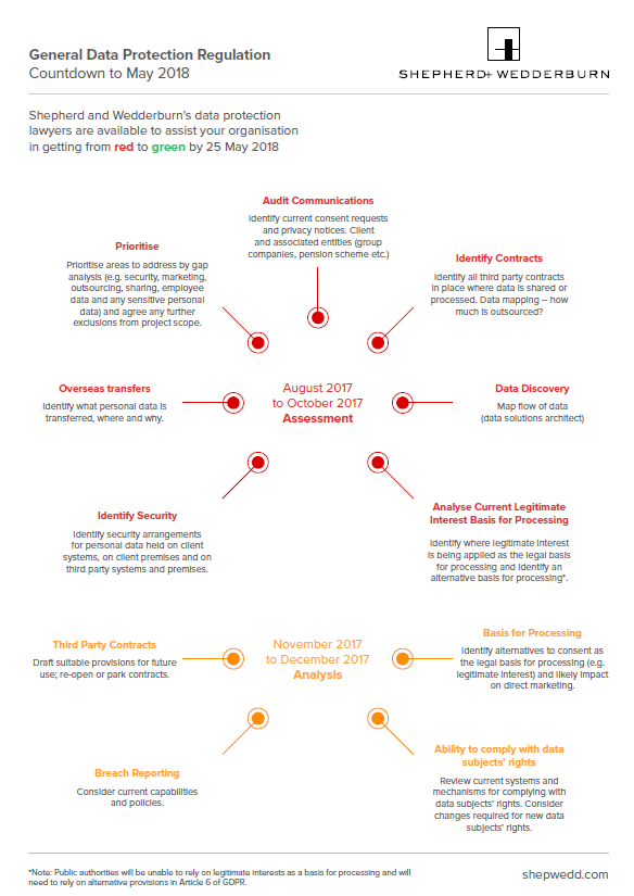 As well as publishing our GDPR Compliance Timeline, Shepherd and Wedderburn has developed a toolkit designed to help clients of all sizes identify and implement the actions that they need to take to ensure that they are GDPR compliant.