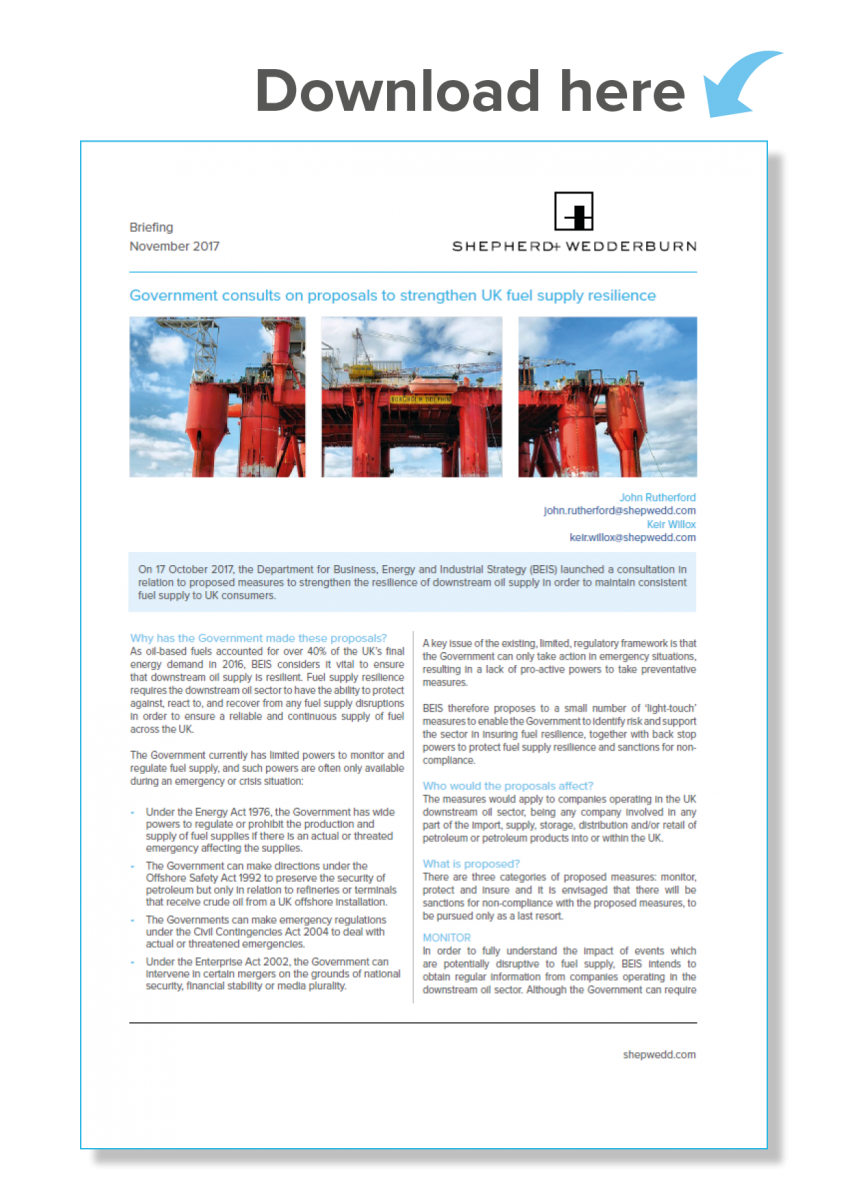 On 17 October 2017, the Department for Business, Energy and Industrial Strategy (BEIS) launched a consultation in relation to proposed measures to strengthen the resilience of downstream oil supply in order to maintain consistent fuel supply to UK consumers.