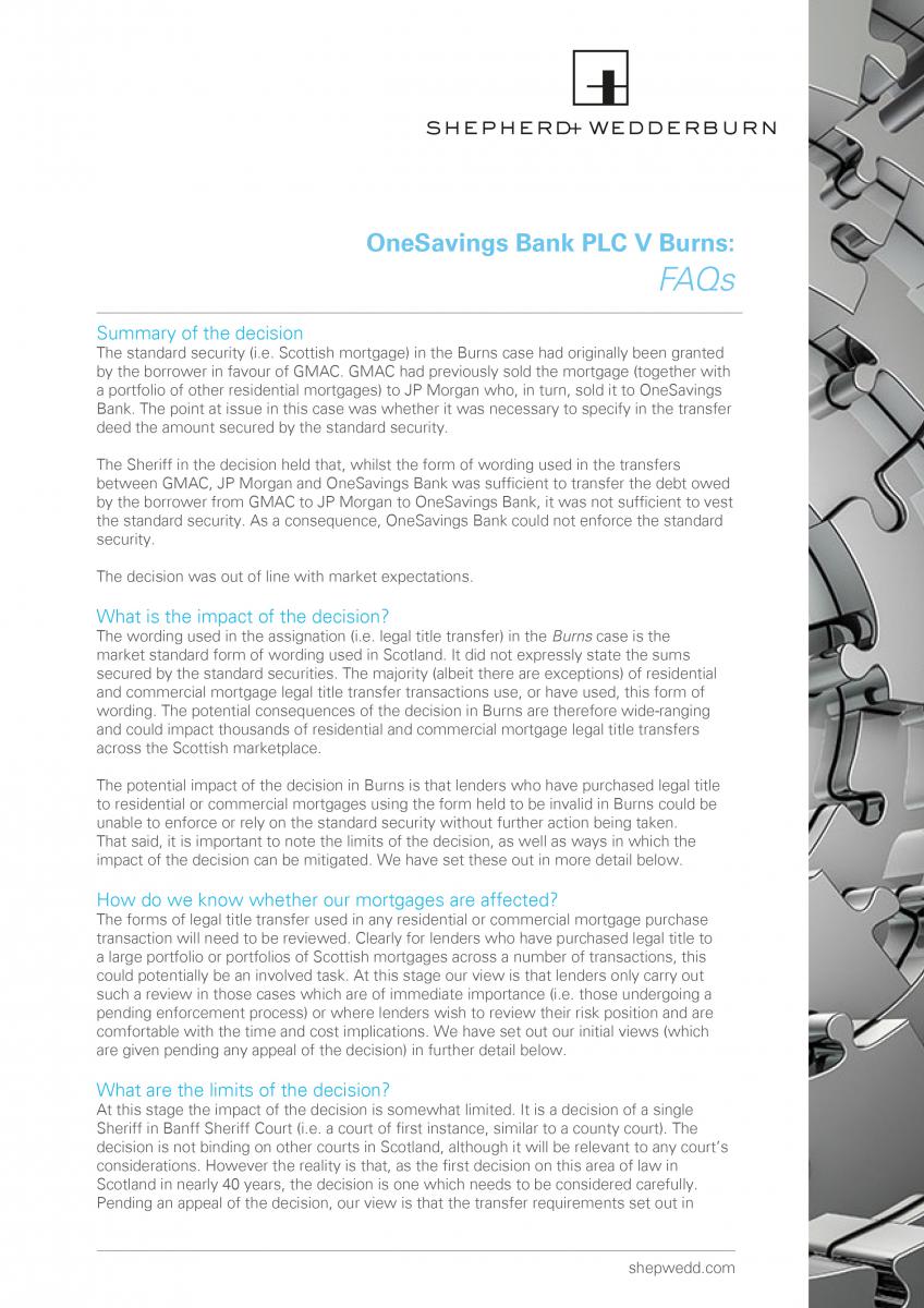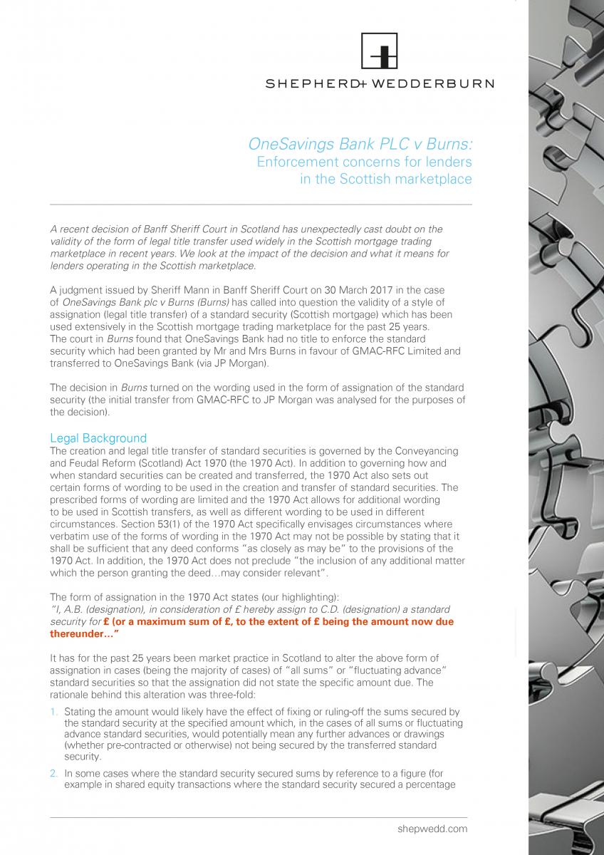 A recent decision of Banff Sheriff Court in Scotland has unexpectedly cast doubt on the validity of the form of legal title transfer used widely in the Scottish mortgage trading marketplace in recent years. We look at the impact of the decision and what it means for lenders operating in the Scottish marketplace.