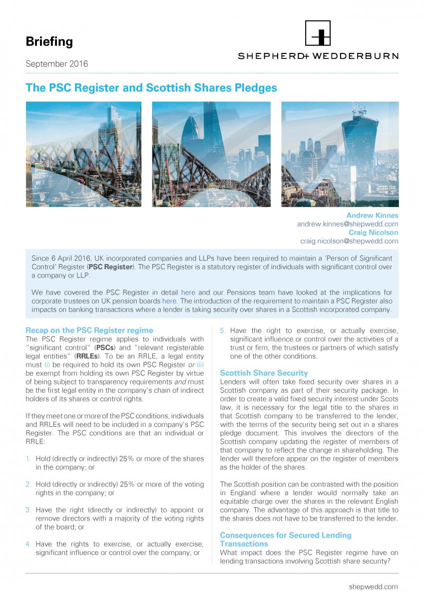 We have covered the PSC Register in detail here and our Pensions team have looked at the implications for corporate trustees on UK pension boards here. The introduction of the requirement to maintain a PSC Register also impacts on banking transactions where a lender is taking security over shares in a Scottish incorporated company.