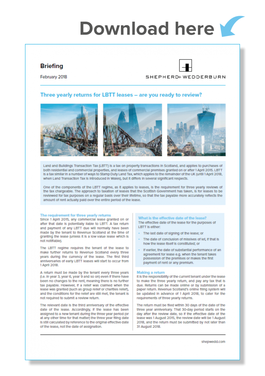 Land and Buildings Transaction Tax (LBTT) is a tax on property transactions in Scotland, and applies to purchases of both residential and commercial properties,and leases of commercial premises granted on or after 1 April 2015. One of the components of the LBTT regime, as it applies to leases, is the requirement for three yearly reviews of the tax chargeable. Tenants of LBTT leases should ensure they are ready to submit a return to Revenue Scotland on the third anniversary of the effective date of the lease.