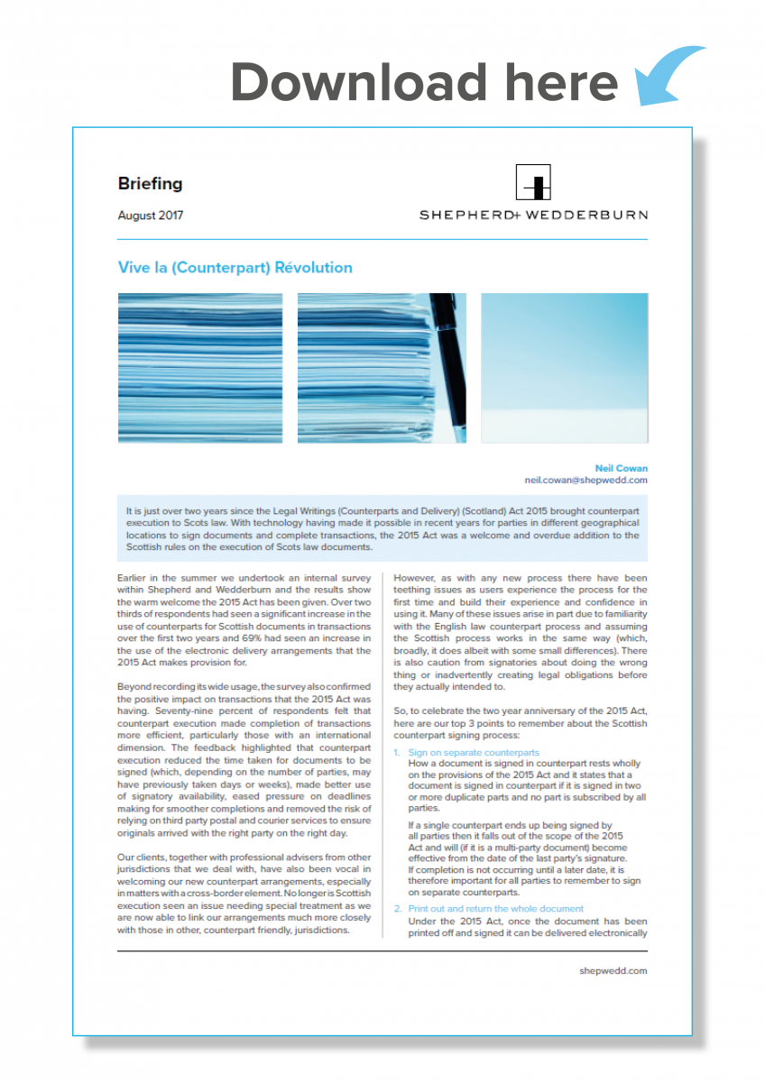 Earlier in the summer we undertook an internal survey within Shepherd and Wedderburn and the results show the warm welcome the 2015 Act has been given. The complete results and what they mean for counterpart arrangements in the UK can be viewed in the briefing below.